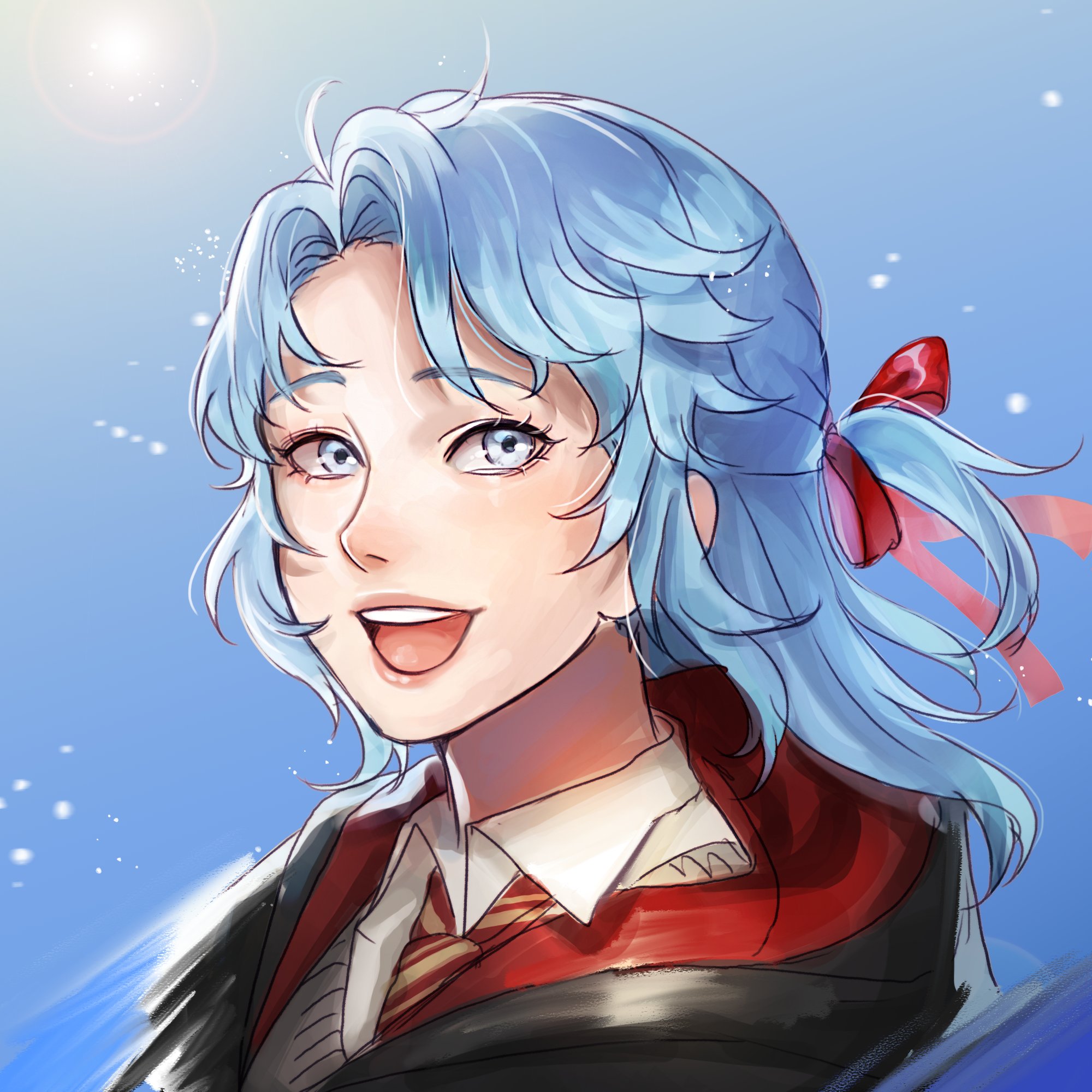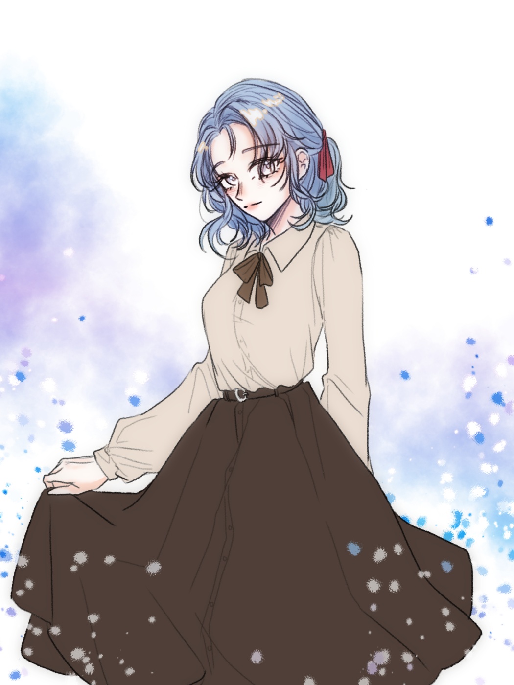 여전한 하늘색 머리에 백색의 눈을 가지고 있습니다. 굳이 다른 점이 있다면 비행 시에 시야를 가리는 일을 막기 위해 앞머리를 오른쪽으로 갈라놓았고, 뒷머리의 일부를 붉은 색의 리본으로 묶어놓았다는 점일까요? 그것만 제외하고는 올라간 눈매와, 백색의 눈. 그리고 활발한 분위기의 인상까지!